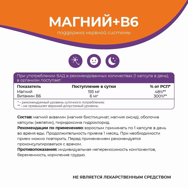 Магний + В6 - комплекс, включающий в себя магний аквамин (бисглицинат) и пиридоксин (Витамин В6). Магний является универсальным регулятором биохимических и физиологических процессов в организме, поддерживает функционирование клеточных мембран, участвует в производстве энергии. Способствует метаболизму кальция и синтезу коллагена. Магний участвует в передаче нервных импульсов и сокращении мышц. Имеет седативные и метаболические свойства, поддерживает когнитивные функции, а в первую очередь внимание и память. Способствует мышечному расслаблению и помогает справиться с судорогами. Участвуя в обмене серотонина, магний как макроэлемент оказывает влияние на серотонинергическую регуляцию сосудистого тонуса, нарушение которой приводит к появлению головной боли. Регулярное применение магния способствует снижению частоты и интенсивности приступов мигрени.Пиридоксин (Витамин В6) – играет важную роль в метаболизме аминокислот, способствует улучшению работы сердечно-сосудистой системы и головного мозга, обеспечивает усвоение белка и питание нервных клеток.